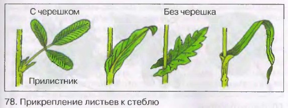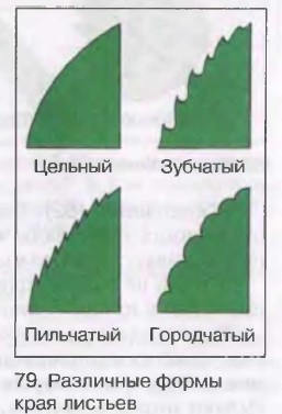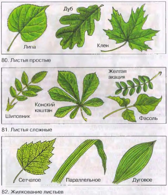 Хотя листья разных растений сильно отличаются по внешнему виду, между ними есть много общего. Большая часть листьев имеет зеленую окраску и состоит из двух частей: листовой пластинки и черешка. Черешок соединяет листовую пластинку со стеблем. Такие листья называют черешковыми. Черешковые листья имеют яблоня, вишня, клен, береза. У листьев таких растений, как алоэ, пшеница, цикорий, лен, черешков нет, они прикрепляются к стеблю основанием листовой пластинки. Их называют сидячими. При основании черешка иногда развиваются выросты — прилистники [78]. По форме листья бывают округлыми, овальными, сердцевидными, игольчатыми и т. д. По форме края п частники листья также разнообразны. Например, лист яблони имеет зубчатый край, осины — пильчатый, сирени — цельнокрайний [79]. Листья простые и сложныеПростые листья, состоящие из одной листовой пластинки, характерны для березы, клена, дуба, черемухи и других растений [80]. Сложные листья состоят из нескольких листовых пластинок, соединенных с общим черешком небольшими черешками. Такие листья у ясеня, рябины и многих других [81].