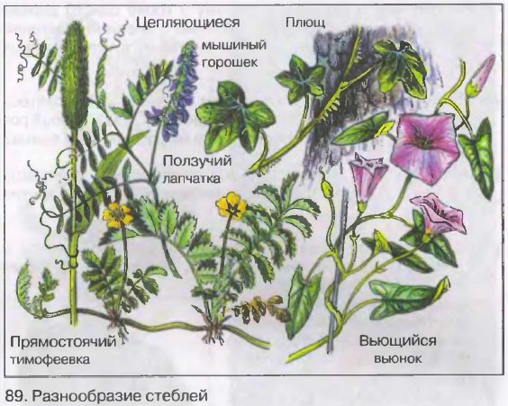 У большинства растений стебли прямостоячие, они растут вертикально вверх. Прямостоячие стебли имеют хорошо развитую механическую ткань, они могут быть одревесневшими (береза, яблоня) или травянистыми (подсолнечник, кукуруза). Вьющиеся стебли, поднимаясь вверх, обвивают опору (вьюнок полевой, фасоль, хмель). Лазающие стебли поднимаются вверх, цепляясь за опору усиками (виноград, горох) или придаточными корнями, отрастающими от стебля (плющ). Ползучие стебли стелются по земле и могут укореняться в узлах (земляника, лапчатка). |