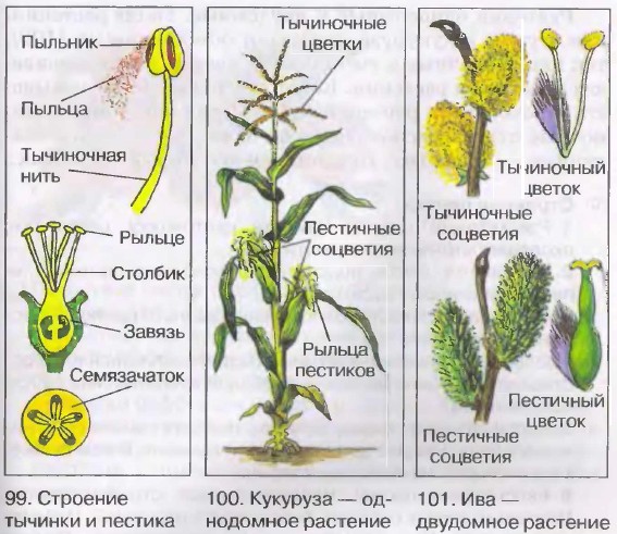 Строение и многообразие покрытосеменных растений § 28. Цветок (продолжение)Цветки правильные и неправильныеЛисточки околоцветника (простого и двойного) могут располагаться так, что через него можно провести несколько плоскостей симметрии (яблоня, вишня, капуста и др.). Такие цветки называют правильными. Цветки, через которые можно провести одну плоскость симметрии (горох, шалфей), называют неправильными. Строение тычинки и пестикаУ яблони каждая тычинка имеет пыльник, внутри которого созревает пыльца [99]. Пыльник расположен на тычиночной нити. Пестик имеет рыльце, столбики и завязь. У яблони пестик образован пятью сросшимися между собой в основании столбиками. В верхней части они свободные и каждый несет по одному рыльцу. Завязь пятигнездная. В гнездах находятся семязачатки, из которых после цветения развиваются семена.