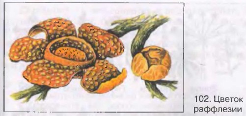 Гигантский цветок раффлезии [102], растущей в лесах тропической Азии, имеет почти метровый размер. Семена ее прорастают на корнях растения-хозяина. Ни стебля, ни листьев у раффлезии нет. Питателычые вещества она получает от растения, на котором вырастает.
