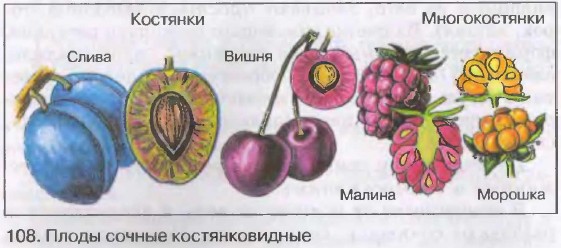 Костянка — сочный плод с тонкой кожицей, мякотью и одревесневшим внутренним слоем околоплодника — косточкой, внутри которой находится одно семя. Костянки имеют вишня, слива, абрикос, черемуха. У некоторых растений костянки много- семянные, например у бузины, крушины.