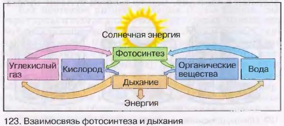 Жизнь растений § 35. Дыхание растений (окончание)Взаимосвязь процессов дыхания и фотосинтезаРастения дышат круглые сутки — и на свету, и в темноте. Но на свету в растении протекают два взаимосвязанных процесса — фотосинтез и дыхание [ 123].