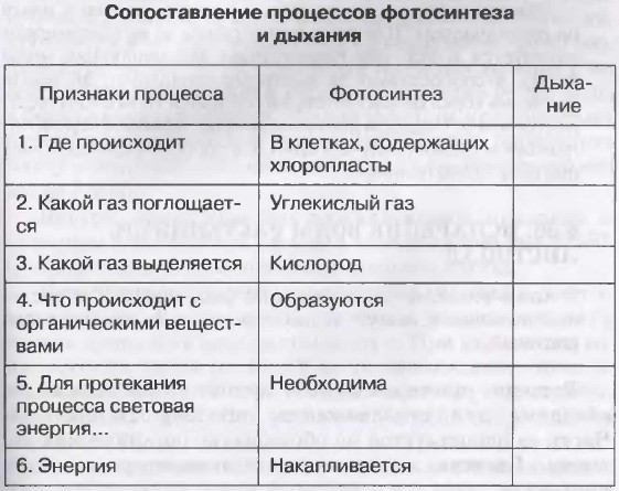 На свету растения поглощают углекислый газ и выделяют кислород. Но они и дышат, т. е. поглощают кислород, но в гораздо меньших количествах, чем выделяют при фотосинтезе. Углекислого газа при фотосинтезе растения поглощают гораздо больше, чем выделяют при дыхании. Так, в солнечный день растения выделяют в 10—20 раз больше кислорода, чем поглощают его при дыхании. Во время фотосинтеза поглощается энергия солнечного света и из неорганических создаются органические вещества. Во время дыхания растение расходует органические вещества, а энергия, необходимая для жизнедеятельности, освобождается. Дыхание во всех живых клетках органов растения происходит непрерывно. Как и животные, растения погибают с прекращением дыхания. Новые понятия Дыхание Ответьте на вопросы 1. Какое значение имеет дыхание? 2 Как можно доказать, что органы растения дышат? 3. Почему нельзя закладывать на хранение влажные семена? 4. Почему культурные растения плохо растут на заболоченных почвах? Задания для самостоятельной работы Чтобы лучше представить различие процессов дыхания и фотосинтеза, перенесите таблицу в тетрадь и заполните ее правую колонку.