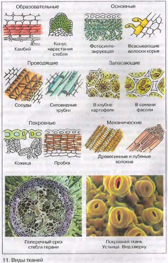 Клеточное строение организмов § 4. Ткани1. Одинаковы ли форма и размеры клеток чешуи кожицы лука и листа элодеи? 2. Какие различия в строении этих клеток вы отметили? Что такое тканьВсе органы растения имеют клеточное строение. Но не все клетки одинаковы. Например, клетки кожицы чешуи лука плотно прилегают друг к другу. Они имеют утолщенные оболочки. Эти клетки защищают растения от неблагоприятных условий внешней среды. Клетки, находящиеся внутри стебля, имеют вид длинных трубочек, по ним передвигаются питательные вещества. Группу клеток, сходных по строению и выполняющих одинаковые функции, называют тканью. Виды тканейВыделяют несколько видов растительных тканей: покровные, основные, механические, проводящие и образовательные [11]. Покровные ткани выполняют защитную функцию. Они образованы живыми или мертвыми клетками с плотно сомкнутыми, утолщенными оболочками. Эти ткани находятся на поверхности корней, стеблей, листьев. Механические ткани придают прочность растениям. Они образованы группами клеток с утолщенными оболочками. У некоторых клеток оболочки одревесневают. Проводящие ткани образованы живыми или мертвыми клетками, которые имеют вид трубок или сосудов. По ним передвигаются растворенные в воде питательные вещества. Основные ткани занимают пространство между покровными, механическими и проводящими тканями. Различают несколько видов этих тканей в зависимости от того, какую функцию выполняют их клетки. Основная их функция — синтез и запасание различных веществ. Клетки образовательных тканей имеют небольшие размеры, тонкую оболочку и относительно крупное ядро. Они делятся, образуя новые клетки, из которых формируются другие ткани.