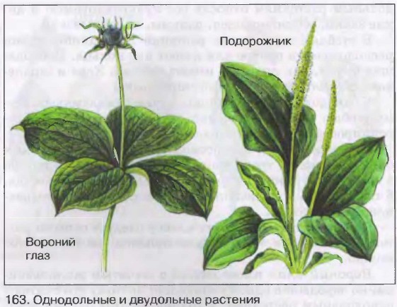 Классификация растении § 46. Деление покрытосеменных растений на классы и семейства (окончание)Вороний глаз имеет листья с сетчатым жилкованием, но зародыш с одной семядолей, поэтому его считают однодольным растением. У подорожника дуговое жилкование листьев, мочковатая корневая система, но его относят к двудольным растениям, так как зародыш имеет две семядоли [163].