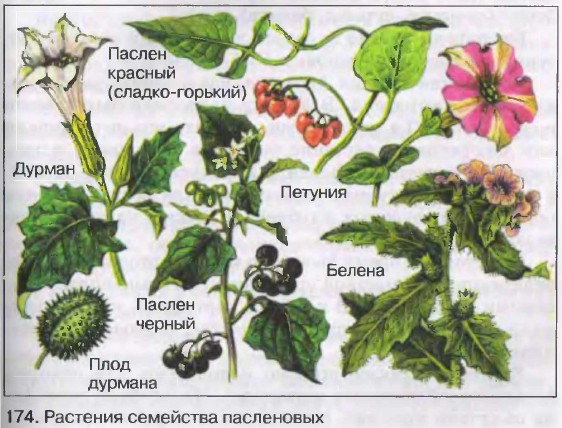 Все пасленовые имеют одинаковое строение цветков и плодов. Цветок этих растений имеет двойной околоцветник: чашечка из 5 сросшихся чашелистиков и венчик из 5 сросшихся лепестков. Тычинок у них по 5, а пестик 1. Формула цветка пасленовых: *Ч(5)Л(5)Т5П1. Плоды либо ягоды (паслен черный, томат), либо коробочки (петуния, дурман, белена). Картофель — одно из самых известных и ценных растений семейства пасленовых [175].
