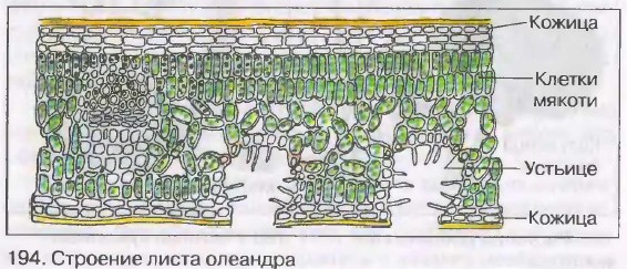 Растения сухих мест обитанияЖивут при значительном недостатке влаги, чаще всего в степях, полупустынях и пустынях. Растения этой экологической группы обычно обладают хорошо развитой корневой системой, многие из них запасают воду в тканях корня, стебля или листьев [193]. Их листья имеют толстую, плотную кожицу, опушение или превращены в колючки (кактусы), устьиц немного, и расположены они, как у олеандра, — в углублениях [194]. На листьях и других органах есть водонепроницаемый восковой налет (сахарный тростник), листья в период засухи могут быть свернуты в трубку (ковыль) (см. [88]).