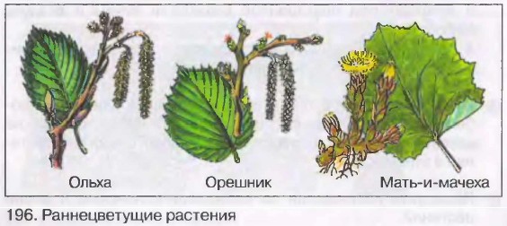 Отметьте, когда началось сокодвижение у этих растений в вашей местности. Цветение ветроопыляемых деревьев и кустарников — второй признак весны. В средней полосе европейской части страны первой зацветает ольха серая [196]. Цветки ее невзрачны, но распустившиеся сережки из тычиночных цветков хорошо заметны. Почти одновременно с ольхой зацветают орешник, мать-и-мачеха. Запишите в тетрадь, когда зацвели эти растения. Какова продолжительность цветения этих растений в вашей местности? Ранней весной цветут многолетние травянистые растения лиственного леса. Они часто зацветают до того, как сойдет снег, поэтому их называют подснежниками. Все они светолюбивы и цветут под пологом леса, когда на деревьях и кустарниках еще нет листвы.