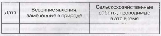 Выясните, какие первоцветы растут в вашей местности. Наблюдая за жизнью растений в природе, составьте календарь весны для своей местности. Запишите в календаре сроки цветения ольхи, мать-и-мачехи, орешника и раннецветущих многолетних растений — подснежников. Затем запишите сроки распускания листьев у березы и липы, зацветания одуванчиков, вишни, сирени, ландыша. Если вы живете в сельской местности, установите, какие виды сельскохозяйственных работ проводят во время того или иного весеннего явления, замеченного вами (например, посев огурцов — во время цветения акации). Записывайте в дневник наблюдения в виде таблицы: