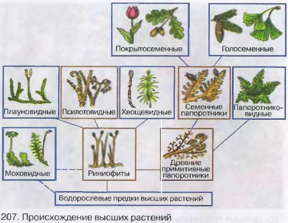 Одними из первых наземных растений были росшие по берегам водоемов риниофиты, например риния [206]. Они существовали 420—400 млн лет назад, а потом вымерли. Строение риниофитов еще напоминало строение многоклеточных водорослей: отсутствовали настоящие стебли, листья, корни, в высоту они достигали около 25 см. Риниофиты имели древовидную форму. Ризоиды, с помощью которых они прикреплялись к почве, поглощали из нее воду и минеральные соли. Наряду с подобием корней, стебля и примитивной проводящей системы риниофиты имели покровную ткань, предохранявшую их от высыхания. Размножались они спорами. Происхождение высших споровых растенийОт риниофитоподобных растений произошли древние плауны, хвощи и папоротники и, по-видимому, мхи, у которых уже были стебли, листья, корни [207]. Это были типичные споровые растения, своего расцвета они достигли около 300 млн лет назад, когда климат был теплым и влажным, что благоприятствовало росту и размножению папоротников, хвощей и плаунов. Однако их выход на сушу и отрыв от водной среды не были еще окончательными. При половом размножении споровым растениям для оплодотворения необходима водная среда.
