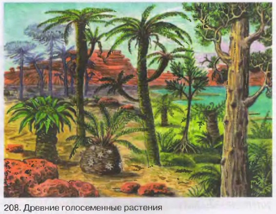 Развитие семенных растенийВ конце каменноугольного периода климат Земли почти повсеместно стал суше и холоднее. Древовидные папоротники, хвощи и плауны постепенно вымирали. Появились примитивные голосеменные растения — потомки некоторых древних папоротниковидных. Происхождение голосеменных от древних папоротниковидных доказывают многие черты сходства между этими растениями. Это сходство не только внешнее. Общие черты наблюдаются в строении органов: стеблей, листьев и корней. Очевидно, предками голосеменных растений были древовидные, лиановидные и травянистые семенные папоротники, впоследствии полностью вымершие. Их семена развивались на листьях, шишек еще не было. Условия жизни продолжали меняться. Там, где климат становился более суровым, древние голосеменные растения постепенно вымирали [208]. Им на смену приходили более совершенные растения — сосна, ель, пихта.
