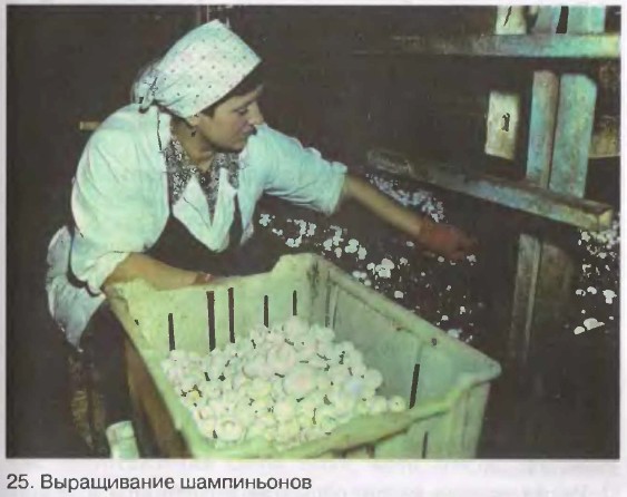 Царства Бактерии и Грибы § 8. Шляпочные грибы (окончание)У съедобных опят на пеньке имеется кольцо из пленки, а у ложных такой пленки нет и пластинки под шляпкой зеленоватые. Чтобы не отравиться грибами, будьте внимательны при их сборе. Если найденный гриб похож на ядовитый или вы сомневаетесь в его съедобности, лучше такой гриб не берите. Старые плодовые тела съедобных грибов тоже могут быть ядовитыми. Нельзя собирать грибы вблизи автомобильных дорог, химических и других промышленных предприятий, загрязняющих вредными веществами окружающую среду. Плодовые тела грибов накапливают эти вещества. Выращивание грибовПлодовые тела многих грибов содержат питательные вещества, полезные для человека. Поэтому некоторые шляпочные грибы издавна выращивают в искусственных условиях. В овощных хозяйствах при крупных городах нашей страны выращивают шампиньоны. В специальных цехах устанавливают четырехъярусные стеллажи (полки). На них в питательную почву высаживают грибницу [25]. В помещении цехов поддерживают такую температуру и влажность воздуха и почвы, при которых плодовые тела быстро растут. С 1 м2 почвы снимают более 20 кг плодовых тел шампиньонов. В год можно получить до пяти урожаев грибов.