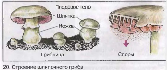 Царства Бактерии и Грибы § 8. Шляпочные грибы1. Какие съедобные грибы вы знаете? 2. Какие ядовитые грибы вам известны? 3. Что такое симбиоз? Среди грибов наиболее известны шляпочные, к ним относятся белые грибы, подберезовики и подосиновики, разноцветные сыроежки, рыжики и многие другие. Строение шляпочного грибаВ повседневной жизни мы называем грибами их плодовые тела. У большинства съедобных грибов (за исключением трюфелей, строчков и сморчков) плодовое тело образовано ножкой и шляпкой. Отсюда и их название.
