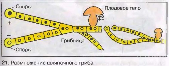 Во влажной, богатой перегноем почве споры грибов прорастают, из них развиваются нити грибницы. Грибница, возникающая из одной споры, может образовывать новые плодовые тела лишь в редких случаях. У большинства видов грибов плодовые тела развиваются на грибницах, образованных слившимися клетками нитей, берущих начало от разных спор. Поэтому клетки такой грибницы двухъядерные. Грибница растет медленно, лишь накопив запасы питательных веществ, она образует плодовые тела. |