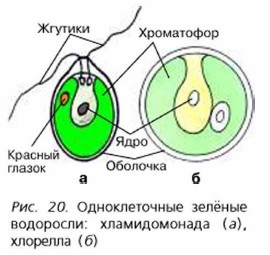 Во время «цветения» мелких луж или водоёмов в воде чаще всего встречается одноклеточная водоросль хламидомонада (с греч. — простейший организм, покрытый одеждой — оболочкой). Хламидомонада — одноклеточная зелёная водоросль грушевидной формы. Она движется в воде при помощи двух жгутиков, находящихся на переднем, более узком конце клетки (рис. 20, а). Снаружи хламидомонада покрыта прозрачной оболочкой, под которой расположены цитоплазма с ядром, красный глазок (светочувствительное тельце красного цвета) и две маленькие пульсирующие вакуоли. Хлорофилл и другие пигменты у хламидомонады находятся в крупной чашеобразной пластиде — хроматофоре. Ещё одна одноклеточная зелёная водоросль, не имеющая жгутиков, — хлорелла широко распространена в пресных водоёмах и на влажных почвах (рис. 20, б). Она имеет мелкие шаровидные клетки. Снаружи клетка хлореллы покрыта оболочкой, под которой находится цитоплазма с ядром, а в цитоплазме — зелёный хроматофор.