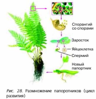 У папоротников, так же как и у мхов, чётко представлено чередование полового (гаметофит) и бесполого (спорофит) поколений (рис. 28). Летом на нижней стороне папоротника образуются маленькие бурые бугорки. В бугорках находятся пучки мелких мешочков — спорангиев, в которых созревают споры. Созревшие споры выпадают из спорангиев. Их разносит ветер. Если они попадают в благоприятные условия, то прорастают, как споры мха. Из проросшей споры папоротника развивается маленькая зелёная пластинка диаметром несколько миллиметров. Это заросток папоротника — гаметофит. Он живёт самостоятельно, прикрепляясь к почве ризоидами.