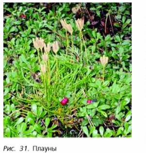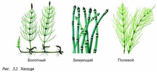 Плауновидные. Плауны (приблизительно 1300 видов) преимущественно многолетние вечнозелёные травянистые растения. Они встречаются в основном в сосновых лесах. У этих растений длинный ползучий стебель с множеством веток, покрытых мелкими листьями (рис. 31). Летом у плаунов на прямостоячих побегах развиваются спороносные колоски. Стелющиеся ветвистые побеги плауна очень декоративны. В настоящее время плаун стал редким, нуждающимся в охране растением. Хвощевидные. Хвощи (свыше 30 видов) — многолетние травянистые растения с длинными ветвящимися корневищами, зимующими в почве. С помощью корневища хвощ размножается вегетативно. От корневища отходят надземные побеги высотой от 10 см до 4—5 м (у некоторых тропических видов). Весной у хвоща полевого появляются бурые побеги, на верхушках которых расположены спороносные колоски. В них созревают споры. Зелёные летние побеги содержат хлорофилл (рис. 32).