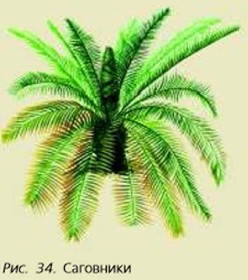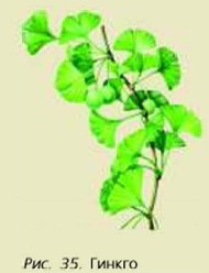 Саговниковые появились ещё в каменноугольном периоде. Их ошибочно называют саговыми пальмами. Растут они в тропических и субтропических районах земного шара. Это пальмовидные деревья, иногда до 20 м в высоту. У некоторых видов наземный стебель не формируется совсем и перистые листья непосредственно отходят от корневища (рис. 34). На верхушках стеблей развиваются огромные, иногда метровые разнополые шишки (по-научному шишки голосеменных называют стробилами). Оплодотворение происходит с помощью жгутиковых сперматозоидов; яйцеклетка огромна (до 6 мм). Жгутики помогают сперматозоидам двигаться в воде в направлении яйцеклетки. Сохранение столь примитивного признака показывает, что нет резкой грани между половым размножением папоротниковидных и голосеменных. У большинства саговников семена крупные, сочные и употребляются местными жителями в пищу. Единственный современный представитель класса Гинкговые — реликтовое растение гинкго двулопастный (рис. 35). Это растение называют живым ископаемым, так как его ближайшие родичи вымерли десятки миллионов лет назад. В дикорастущем состоянии он встречается только в горах Западного Китая. Гинкго — листопадное дерево, достигающее более 30 м в высоту, с диаметром ствола более 3 м. Его листья имеют характерную вееровидную лопастную пластинку на топком черешке.