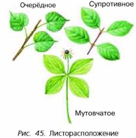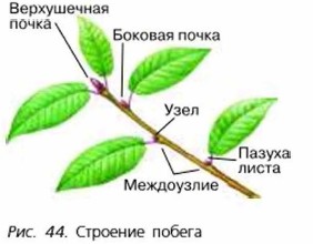 Стебель с расположенными на нём листьями и почками называют побегом. Стебель — осевая часть побега, листья — боковые. Участки стебля, на которых развиваются листья, называют узлами, а участки стебля между двумя ближайшими узлами одного побега — междоузлиями (рис. 44). Многие растения имеют побеги двух типов: одни с длинными, а другие с короткими междоузлиями. Угол между листом и находящимся выше междоузлием носит название пазуха листа. Листорасположение (рис. 45). У большинства растений наблюдается очерёдное, или спиральное, листорасположение, при котором листья растут по одному в узле и располагаются на стебле поочерёдно по спирали. Такое расположение листьев имеют берёза, ива, рожь, подсолнечник и другие растения. Если листья растут по два в узле — один лист против другого, например у клёна, сирени, крапивы, фуксии, то такое их расположение называют супротивным. У растений с мутовчатым расположением листьев они развиваются по три и более в узлах, как, например, у элодеи, олеандра. ПочкиНа вершине побега обычно имеется верхушечная почка, а в пазухах листьев — пазушные (боковые) почки (см. рис. 44). Почки, которые развиваются не в пазухе листа (на междоузлиях, листьях, корнях), называют придаточными.