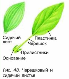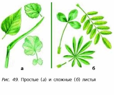 Хотя листья разных растений сильно различаются по внешнему виду, между ними есть много общего. У большинства растений листья имеют зелёную окраску и состоят из основания и листовой пластинки. У большинства листьев между пластинкой и основанием имеется суженная стеблевидная часть — черешок. Такие листья называют черешковыми. Черешковые листья имеют яблоня, вишня, клён, берёза. У листьев таких растений, как алоэ, пшеница, цикорий, лён, черешков нет. Их называют сидячими. Иногда основание имеет парные выросты — прилистники (рис. 48). По форме листья бывают округлыми, овальными, сердцевидными, игольчатыми и т. д. По форме края пластинки листья также разнообразны. Например, лист яблони имеет зубчатый край, осины — пильчатый, сирени — цельнокрайний. Листья простые и сложныеПростые листья, состоящие из одной листовой пластинки, характерны для берёзы, клёна, дуба, черёмухи и других растений (рис. 49, а). Сложные листья состоят из нескольких листовых пластинок, соединённых с общим черешком небольшими черешками. Такие листья у ясеня, рябины, малины и многих других растений (рис. 49, б).