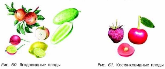Костянковидные плоды (рис. 61). К ним относятся плоды с сочной мякотью и твёрдой косточкой. Костянка — сочный плод с тонкой кожицей, мякотью и одревесневшим внутренним слоем околоплодника — косточкой, внутри которой находится одно семя. Костянки имеют вишня, слива, абрикос, черёмуха. У некоторых растений костянки многосемяниые, например у бузины, крушины. Многокостянка — на белом коническом сухом цветоложе расположены многочисленные сочные костянки. Такой плод у малины, костяники. Созревшие сухие плоды сочной мякоти не имеют.