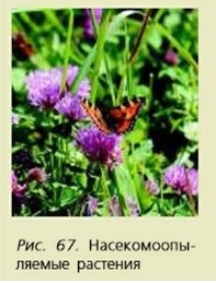 В связи с опылением у растений выработались особые признаки. В зависимости от способа переноса пыльцы среди перекрёстноопыляемых растений выделяют насекомоопыляемые и ветроопыляемые. Признаки насекомоопыляемых растений. Крупные одиночные цветки, мелкие цветки, собранные в соцветия, яркая окраска лепестков или листочков простого околоцветника, наличие нектара и аромата — признаки насекомоопыляемых растений. Крупная, липкая, шероховатая пыльца таких растений хорошо прилипает к мохнатому телу насекомого. Перемазавшись в пыльце, насекомые перелетают с одного растения на другое и переносят прилипшие к телу пылинки на рыльца пестиков соседних цветков (рис. 67).