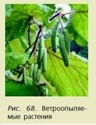 Глава 2. Многообразие растительного мира § 30. Размножение покрытосеменных растений (окончание)Призпаки ветроопыляемых растений. У растений, опыляемых ветром, не бывает ярких, крупных и душистых цветков (рис. 68). Невзрачные, обычно мелкие цветки, часто собранные в соцветия, перистые рыльца, пыльники на длинных свисающих нитях, очень мелкая, лёгкая, сухая пыльца — всё это приспособления к опылению ветром.