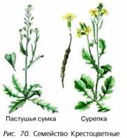 Семейство Крестоцветные включает около 3200 видов растений. Всем растениям этого семейства свойственны общие признаки (рис. 70). Для них характерны цветки одинакового строения, с крестообразно расположенными лепестками, чашечкой из 4 чашелистиков, венчиком из 4 лепестков, с б тычинками (2 короткие и 4 длинные) и 1 пестиком. Формула цветка крестоцветных: *Ч4Л4Т4+2П1. Соцветие — кисть; плоды — стручки или стручочки, т. е. короткие стручки. Длина стручков не более чем в 2—3 раза превышает ширину. Листья крестоцветных расположены на стебле поочерёдно или собраны в прикорневую розетку. Корневые системы стержневые. У некоторых растений образуются корнеплоды. В семейство крестоцветных входят редька дикая, пастушья сумка, ярутка полевая, желтушник левкойный, гулявник лекарственный. Культурные растения семейства крестоцветных
