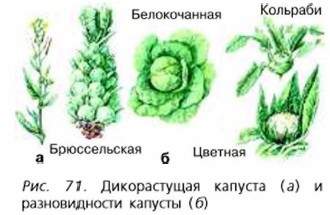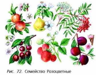 Наиболее ценное культурное растение из семейства крестоцветных — капуста. Человек выращивает капусту уже более 4 тыс. лет. Предком культурных сортов капусты была капуста дикая, встречающаяся и в наши дни в некоторых районах Средиземноморья. Это небольшое растение с высоким стеблем и округлыми листьями, не образующее кочана. За много веков выращивания человек вывел самые разнообразные сорта и разновидности капусты (рис. 71). В семейство крестоцветных входят также овощные и кормовые культуры — редька, брюква, редис; масличные — рапс, горчица, рыжик; декоративные — левкой, алиссум и др. Хрен также относят к крестоцветным и наряду с горчицей употребляют в пищу как приправу. Многие крестоцветные — хорошие медоносы, некоторые используют как лекарственные растения. Семейство РозоцветныеСемейство Розоцветные объединяет около 3000 видов. Растения, принадлежащие к этому семейству, широко распространены и очень разнообразны: среди них есть травы, кустарники и деревья. Многие плодово-ягодные и декоративные растения относятся к этому семейству, например яблоня, груша, вишня, слива, абрикос, черёмуха, рябина, малина, земляника и многие другие (рис. 72). Из дикорастущих травянистых растений к семейству розоцветных относятся различные виды лапчаток, гравилата, таволги и др.