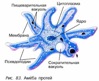 Если за живой амёбой наблюдать под микроскопом, то можно увидеть, как она образует длинные, лопастные, тупо заканчивающиеся ложные ножки — псевдоподии. Опи всё время меняют форму. Часть псевдоподий вытягивается внутрь. Часть, напротив, удлиняется, ипогда разветвляется. Тело амёбы как бы переливается в псевдоподии. В нескольких точках они прикрепляются к субстрату. Благодаря образованию псевдоподий амёба способна к поступательному движению. Питание амёбы. Псевдоподии служат не только для передвижения. С их помощью амёба захватывает пищу. Наталкиваясь псевдоподией на пищевую частицу (водоросль или бактерию), амёба обтекает её со всех сторон и постепенно включает внутрь цитоплазмы вместе с небольшим количеством жидкости. Так в цитоплазме образуется пузырёк с пищевыми включениями — пищеварительная вакуоль. В ней происходит переваривапие пищи — внутриклеточное пищеварение. Через некоторое время непереваренные остатки пищи удаляются наружу.