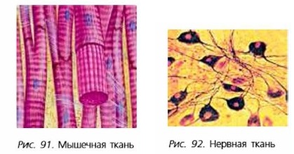 Глава 3. Многообразие животного мира § 37. Ткани, органы и системы органов многоклеточных животных (продолжение)Мышечная ткань образована клетками, которые способны сокращаться в ответ на раздражения (рис. 91). Благодаря сокращениям мышечных клеток осуществляются разнообразные движения тела животного и его органов. Мышечные клетки длинные и тонкие. Поэтому их называют мышечными волокнами. Различают поперечно полосатую и гладкую мышечные ткани. Нервная ткань представляет специфичную для животпых систему, которая обеспечивает взаимосвязь тканей и органов в многоклеточном организме (рис. 92). Нейроны — это нервные клетки, которые способны воспринимать раздражения из внешней или внутренней среды, преобразовывать их в нервные импульсы и передавать другим клеткам.