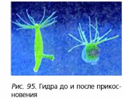 Среди гидр встречаются гермафродиты — животные, у которых на одной особи развиваются и мужские, и женские половые клетки. Благодаря нервным и чувствительным клеткам гидра способна отвечать на механические и химические воздействия. В ответ на раздражение гидра сжимается в комочек (рис. 95). Реакция гидры на прикосновения, изменение тем пературы, появление в воде раство рённых веществ, изменение осве щённости является рефлексом.