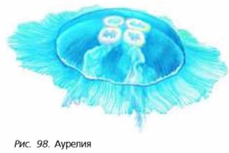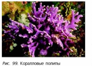 Одним из самых распространённых видов сцифоидных медуз является аурелия (рис. 98). Она обитает почти во всех умеренных и тропических морях, иногда встречается и в арктических областях. В нашей стране аурелия живёт в Балтийском, Белом, Баренцевом, Чёрном, Азовском, Японском и Беринговом морях. Это совершенно безвредное животное. Уплощённый зонтик аурелии иногда достигает 40 см в диаметре. Аурелия — плохой пловец. Благодаря сокращениям зонтика она может лишь медленно подниматься к поверхности, а затем погружаться в глубину. Класс Коралловые полипыПредставители этого класса живут только в морях и океанах, ведя прикреплённый образ жизни (рис. 99). Большинство из них образует колонии, но есть и одиночные организмы.