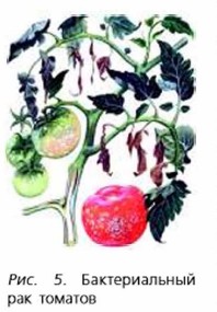 Однако некоторые виды бактерий наносят человеку вред. Они вызывают заболевания человека, животных и растений: чуму, столбняк, холеру, дифтерию, сибирскую язву, ботулизм и т. д. Болезни наносят огромный ущерб хозяйству. Так, от бактериального рака томатов может погибнуть 70—90% урожая (рис. 5). Бактерии вызывают и такое широко распространённое заболевание, как кариес зубов. Они являются причиной пищевых отравлений, ангины, бронхита и других воспалительных процессов. Для предупреждения бактериальных заболеваний человека установлен строгий врачебный контроль за источниками воды и пищевыми продуктами. Так, на водопроводных станциях воду очищают в специальных отстойниках, пропускают её через фильтры, обеззараживают (хлорируют, озонируют).