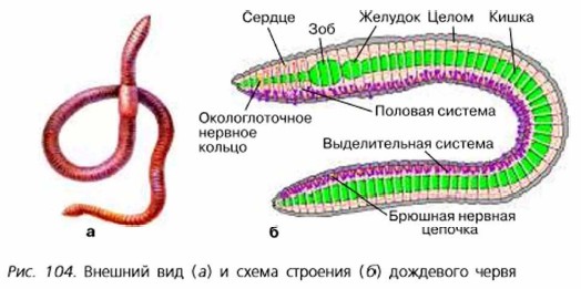 Глава 3. Многообразие животного мира § 41. Тип Круглые черви и тип Кольчатые черви (продолжение)Тип Кольчатые червиТип Кольчатые черви — многочисленная группа животных. Их удлинённое тело состоит из повторяющихся сегментов, или колец. Отсюда и пазвапие типа — кольчатые. Кожно-мускульный мешок кольчатых червей образован кожными покровами, сросшимися с кольцевыми и продольными мышцами. Под ним расположена выстланная слоем клеток вторичная полость тела — цело́м. Сквозная пищеварительная система кольчатых червей начинается ртом и заканчивается анальным отверстием. Кровеносная система замкнута, и кровь течёт только по сосудам. Нервная система состоит из окологлоточного нервного кольца и брюшной нервной цепочки. Кольчатые черви, как правило, являются раздельнополыми животными. Дождевой червь обыкновенный — широко распространённый представитель кольчатых червей. У пего длинное, гибкое, заострённое на концах тело (рис. 104, а). Поперечные перетяжки делят тело червя на 100—180 сегментов (колец). На каждом сегменте снаружи расположены четыре пары маленьких упругих щетинок. Они служат опорой при движении, обеспечивают отталкивание от почвы и предотвращают соскальзывание назад. Дождевые черви обитают в прохладной, влажной почве. Они избегают солнца, которое высушивает их кожу. От влажности кожи зависит дыхание червя. Необходимый для дыхания кислород проникает в тело дождевого червя только через влажную и покрытую слизью кожу. Под кожей в теле червя находится два слоя мышц: кольцевые и продольные. Сросшиеся кожные покровы и мышцы образуют кожно-мускульный мешок.