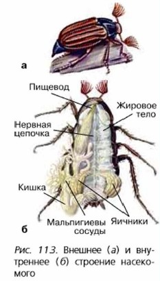 На спинной стороне жука видны жёсткие надкрылья. Это изменённые передние крылья. Надкрылья защищают задние перепончатые крылья и спинную сторону брюшка с мягкими покровами. Жёсткие передние крылья — характерный признак всех жуков, которых объединяют в отряд жесткокрылых. Перед полётом жук поднимает и отводит в стороны надкрылья, расправляет сложенные под ними крылья и взлетает. У многих других насекомых, например бабочек, стрекоз, пчёл, все четыре крыла по плотности одинаковые. Крылья есть у большинства взрослых насекомых, по не у всех. Крыльев не имеют блохи, клопы, вши и некоторые другие насекомые. Обычно это связано с приспособлением к паразитизму. С грудью соединено брюшко, оно состоит из восьми сегментов. Если приподнять надкрылья жука и раздвинуть тонкие перепончатые крылья, то на каждом членике будут видпы маленькие отверстия — дыхальца. Внутреннее строение насекомыхПолость тела насекомых заполнена жировыми клетками, которые образуют жировое тело (рис. 113, б). Это запас питательных веществ. Питание. Взрослый майский жук питается листьями деревьев и кустарников. Заострёнными концами верхних челюстей он отгрызает небольшой кусочек листа, а зазубренными краями нижних челюстей измельчает его. Ротовые органы, которыми насекомые откусывают и измельчают твёрдую пищу, называют грызущими. Проглоченная нища попадает в пищевод, а затем в желудок. Дальнейшее переваривание пищи и всасывание питательных веществ происходят в кишечнике. Непереваренные остатки выводятся через анальное отверстие. В зависимости от способов питания ротовые органы насекомых имеют разное строение. У бабочек и других насекомых, питающихся жидкой пищей, ротовые органы преобразованы в тонкий и длинный хоботок и называются сосущими. Кровеносная система у насекомых незамкнутая. Движение крови обеспечивают сокращения сердца — продольной мускулистой трубки, расположенной в спинной части над кишечником. Ритмично пульсируя, сердце толкает кровь в головной отдел тела. Обратному току крови препятствуют клапаны сердца. В полости тела кровь течёт от переднего конца к заднему. В газообмене кровь не участвует. Дыхательная система майского жука представлена густой сетью разветвлённых внутренних трубочек — трахей. По ним воздух, попадая через наружные дыхальца, доставляется ко всем органам. Выделительную систему образуют мальпигиевы сосуды — пучок тонких трубочек, расположенных в полости тела. Нервная система состоит из окологлоточного нервного кольца и брюшной нервной цепочки. В голове скопления нервных клеток образовали головной мозг. У пчёл, муравьёв и других насекомых со сложным поведением размеры головного мозга увеличены.