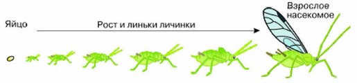 Рост и развитие насекомых от откладывания яиц до появления взрослой особи у разных групп насекомых происходят неодинаково. У комаров, клопов и прочих насекомых, питающихся соками растений или кровью животных, ротовой аппарат называется колюще-сосущим. У тараканов, саранчи, клопов из яйца выходит личинка, сходная по внешнему виду, образу жизни и питанию со взрослыми насекомыми. Маленькая личинка питается, линяет и растёт. После каждой линьки личинка становится всё более похожей на взрослое насекомое. Во взрослом состоянии насекомые не растут и не линяют. Развитие, при котором насекомое проходит три стадии: яйцо — личинка — взрослое насекомое, называют развитием с неполным превращением.