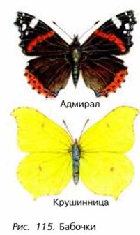 Отряд Чешуекрылые, или Бабочки. Характерной особенностью бабочек являются две пары больших крыльев, покрытых чешуйками (рис. 115). Поэтому бабочек называют чешуекрылыми. Важным признаком бабочек является строение их ротовых органов. Обычно это мягкий хоботок, способный свёртываться и развёртываться наподобие часовой пружины. Оп приспособлен к питанию жидкой пищей, чаще всего нектаром цветков. Перелетая в поисках пищи с цветка на цветок, бабочки могут переносить на себе пыльцу, способствуя перекрёстному опылению растений.