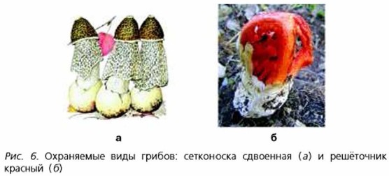 Вопрос о положении грибов в системе органического мира издавна привлекал внимание учёных. Долгое время грибы относили к царству растений за их сходство: они, как и растения, неподвижны и растут всю жизнь. Подобно растениям, грибы всасывают питательные вещества поверхностью тела в отличие от животных, которые заглатывают пищевые комочки. Однако грибы существенно отличаются от растений: в их клетках нет хлоропластов, поэтому они не способны к фотосинтезу и используют в пищу готовые органические вещества. Есть у грибов сходство и с животными: оболочки клеток гриба твёрдые и состоят из хитина. Это вещество входит также в состав наружного скелета ряда животных: насекомых, рака, паука. Как и животные, грибы — гетеротрофные организмы. Таким образом, грибы совмещают в себе некоторые признаки и растений, и животных. По способу поглощения питательных веществ (всасыванию) грибы сходны с растениями, а по типу питания (гетеротрофное) и химическому составу — с животными. Поэтому грибы нельзя отнести ни к царству растений, ни к царству животных, они представляют собой самостоятельное царство — Грибы. Большинство грибов — обитатели суши, но есть морские и пресноводные грибы. Поселяются грибы на растительных и животных остатках, на живых оргапизмах, на продуктах питания, на металлических и резиновых изделиях, на штукатурке в квартире. Вы уже знаете, что грибы существенно отличаются от организмов других царств строением тела. Оно состоит из множества переплетённых нитей, называемых гифами. Вся масса нитей составляет вегетативное тело, называемое также мицелием или грибницей. Гифы имеют стенку, в состав которой входит хитин. Он и придаёт нити жёсткость. У некоторых видов грибов нити плотно прилегают друг к другу и образуют плодовые тела, например у шляпочных грибов. Плодовые тела чрезвычайно разнообразны по форме, размерам и окраске. Необычайно яркая расцветка и причудливая форма плодовых тел некоторых видов грибов, обитающих в тропиках, позволили называть их грибами-цветами. В нашей стране из грибов-цветов можно встретить сетконоску сдвоенную, или «даму с вуалью», решёточник красный, весёлку обыкновенную, мутинус Равенеля и др. Все они являются охраняемыми видами (рис. 6).