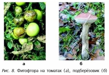 Грибы, как и все живые организмы, состоят из клеток. Клетка грибов имеет клеточную стенку (рис. 7). В этом проявляется их сходство с растениями и бактериями. Жёсткость клеточной стенки делает грибы неподвижными или малоподвижными организмами. В цитоплазме расположено ядро, в котором сосредоточены хромосомы — носители наследственной информации. Поэтому грибы относят к ядерным организмам. В грибной клетке бывает от одного до нескольких ядер. По способу питания грибы — гетеротрофные организмы. Среди них, как и среди бактерий, различают сапротрофы, паразиты и симбиотические организмы. Сапротрофы питаются мёртвыми органическими остатками, используя в пищу навоз, перегной, пищевые продукты. Паразиты высасывают соки из живых тканей (рис. 8, а). При симбиозе нити грибницы плотно оплетают корни дерева, образуя микоризу. Из грибницы минеральные вещества поступают в корни, а из корней грибы получают органические вещества (рис. 8, б).