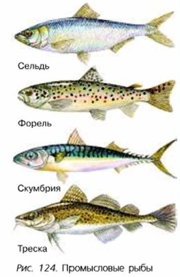 Рыбы, которых ловят в большом количестве, называются промысловыми (рис. 124). Важнейшее промысловое значение в мире имеют атлантическая и тихоокеанская сельди, анчоусы, треска, пикша, навага. За прекрасные вкусовые качества высоко ценятся кета, горбуша, сёмга, форель. С давних времён желанной добычей человека являются осетровые рыбы — осетр, белуга, стерлядь. Чрезмерный вылов многих особо ценных промысловых рыб наносит значительный урон мировым запасам рыбы. Большое отрицательное влияние на рыб оказывает непродуманная хозяйственная деятельность человека: лесосплав, спуск в естественные водоёмы сточных вод, загрязнение водоёмов нефтепродуктами, удобрениями. Для сохранения и увеличения рыбных запасов в странах с развитым рыболовством принимают рыбоохранные законы. В России первые законы об охране рыбы были созданы при Петре I. Сегодня в нашей стране правительственными постановлениями регламентируются количество, место и время лова рыбы. Запрещены способы и орудия лова, приводящие к массовой гибели рыбы. Ведётся работа по оснащению предприятий очистными сооружениями, регулируется вырубка лесов у берегов рек, разрабатываются научные основы рационального хозяйствования и сохранения рыбохозяйственных угодий.