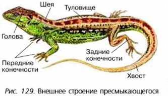 Класс ПресмыкающиесяКласс Пресмыкающиеся объединяет первых настоящих наземных позвоночных животных, размножение и развитие которых происходит на суше. Большинство видов пресмыкающихся откладывает довольно крупные яйца, покрытые кожистой оболочкой или твёрдой известковой скорлупой. Из яиц выходят маленькие, но вполне сформировавшиеся животные. Дыхание у пресмыкающихся лёгочное. Температура их тела зависит от температуры окружающей среды. Большинство видов пресмыкающихся обитает в тропической и субтропической зонах. В странах с умеренным климатом этих животных значительно меньше. Среди пресмыкающихся есть животные наземные, подземные, живущие на деревьях. Представители некоторых видов обитают в воде, но большинство ведёт наземный образ жизни. Корма и способы их добывания у пресмыкающихся весьма разнообразны. Большинство из них хищники, но есть и растительноядные. Таковы почти все сухопутные черепахи. Внешнее строение пресмыкающихсяВнешнее строение пресмыкающихся рассмотрим на примере ящерицы. Это наиболее многочисленная и широко распространённая группа современных пресмыкающихся. Тело ящериц подразделяется на голову, шею, туловище и хвост (рис. 129).