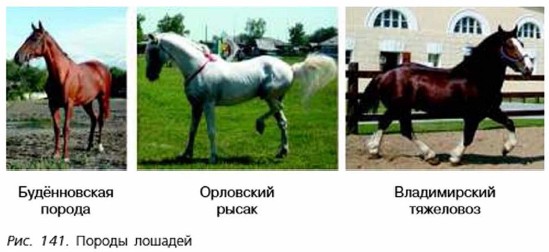 Домашние животныеПриручение и одомашнивание диких зверей началось в далёком прошлом, продолжается и сегодня. Около 15 тыс. лет назад была одомашнена собака. Сейчас известно несколько сотен пород служебных, охотничьих, декоративных собак. В Древнем Египте была впервые одомашнена кошка. ЖивотноводствоЖивотноводство — широкая отрасль сельского хозяйства, включающая пчеловодство (см. § 47), рыбоводство (см. § 50), птицеводство (см. § 54), а также разведение одомашненных млекопитающих: коров, коз, овец, лошадей, свиней, кроликов, нутрий. Их разведение и выращивание обеспечивает человека ценными пищевыми продуктами (мясом, молоком, жиром), а также промышленным сырьём (шерстью и кожей). Побочная продукция животноводства — навоз. Его применяют как ценное органическое удобрение, восстанавливающее плодородие почв и улучшающее их структуру. В разных природных зонах нашей страны разводят те породы животных, которые наиболее приспособлены к местным условиям и высокопродуктивны. Современное животноводство развивается но пути создания крупных животноводческих комплексов, которые весь год снабжают население продуктами питания, а промышленные производства — сырьём. Специальная наука — зоотехника большое внимание уделяет правильному содержанию и полноценному кормлению животных, а за их здоровьем следит специальная ветеринарная служба. Разведение крупного рогатого скотаБольшое значение в хозяйственной деятельности человека имеет разведение крупного рогатого скота: коров, буйволов, яков. Особенно важно для человека разведение коров. Выведено множество их пород, различающихся по массе, размерам, физиологическим особенностям, продуктивности. Существуют породы коров молочной, мясной и комбинированной направленности. От коровы молочной породы при хорошем уходе в год получают около 5000 кг молока. Из молочных пород одной из лучших в России является ярославская порода. Скороспелостью и большой массой отличается крупный рогатый скот мясной направленности. В мире одной из лучших мясных пород признана герефордская порода. КоневодствоЛошадь всегда была верным помощником пахаря, воина, охотника и путешественника. Человек с древнейших времён совершенствовал качества лошадей и создал три основные группы пород — верховые, упряжные и тяжеловозные (рис. 141). Рабочие лошади незаменимы в условиях бездорожья. Их используют на вспомогательных работах, механизация которых затруднена. На верховых лошадях пасут скот, производят милицейское патрулирование. Большой популярностью пользуются конные виды спорта. Лошади с красивыми, свободными движениями проходят специальный курс обучения и послушания всаднику. При обращении с лошадьми следует выполнять несколько правил, например: подходить к лошади следует строго слева, а сзади нельзя — она может испугаться и лягнуть.