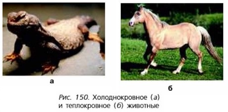 Каждый вид существует лишь при определённой температуре. У многих холоднокровных животных умеренных широт зимой сильно снижается интенсивность обмена веществ, они становятся малоактивными (лягушки, змеи, ящерицы) (рис. 150, а). У теплокровных животных (птиц, зверей) интенсивный обмен веществ и теплоотдачу уменьшает наличие перьев, пуха, подкожного слоя жира, волосяного покрова (рис. 150, б).