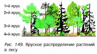Одно из приспособлений к использованию света — расселение организмов ярусами — этажами (рис. 149). Благодаря этому растения, например, не затеняют друг друга и хорошо освещаются. В зависимости от ярусности растений можно наблюдать и распределение животных.