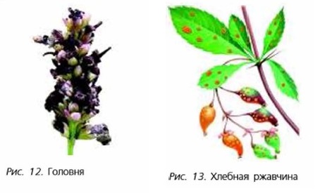 Среди грибов достаточно широко распространены паразиты. Они вызывают различные болезни растений, животных, человека. Типичные паразиты растений — головнёвые и ржавчинные грибы. Известно около 1000 видов головнёвых грибов. Они поражают все органы растения. При этом растения приобретают вид обугленных или покрытых сажей (рис. 12). Эта «тёмная пыль» представляет собой скопление спор. Споры попадают на органы растения и прорастают. Мицелий гриба проникает в клетки растения, где разрастается и нарушает процессы жизнедеятельности. Часто зерновки пшеницы разрушаются полностью. Вместо одной зерновки пшеницы образуется от 8 до 20 млн спор гриба.
