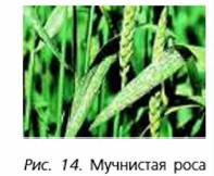 Большой ущерб сельскому хозяйству наносят и ржавчинные грибы (рис. 13). На заболевшем растении появляются пятна или полосы ржаво-бурого цвета. Поселившиеся грибы нарушают налив зерна. В годы сильного поражения злаков этим грибом потери урожая огромные. Основной способ борьбы с грибами — паразитами растений — выведение устойчивых к ним сортов. Болезнь мучнистую росу вызывают мучнисторосяные грибы (рис. 14). При этом на растении сначала появляется белый пушок, а затем грибница быстро стареет и становится бурой. Рост поражённых растений замедляется. Особенно бурно развивается мучнистая роса в условиях повышенной влажности и умеренной температуры.