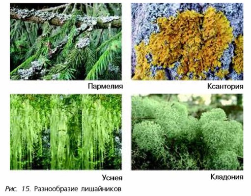 Лишайники — группа организмов, представляющая собой сожительство гриба и водоросли (или цианобактерии). Они были известны ещё в III в. до н. э. За своеобразный внешний вид их называли «хаосом природы», «убогой нищетой растительности» (рис. 15). В настоящее время известно более 20 тыс. видов лишайников. Одни из них настолько малы, что почти не видны невооружённым глазом, другие, например ягель, покрывают огромные площади ковром глубиной в несколько сантиметров. Лишайники занимают особое место в системе органического мира. Их нельзя отнести ни к растениям, ни к животным, ни к грибам. Лишайники представляют собой самостоятельную группу комплексных симбиотических организмов, так как их тело — слоевище, или таллом (от греч. таллос — побег), — состоит из двух организмов — гриба и водоросли. Взаимосвязь этих организмов в лишайнике постоянная, она сформировалась в процессе эволюции. Окраска лишайников разнообразна: от белой до чёрной с красными, жёлтыми, зелёными, оранжевыми оттенками. Она зависит от содержания в клетках пигментов.