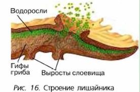 Комплексный организм лишайника отличается как от гриба, так и от водоросли. У лишайника особый тип питания и своеобразное размножение. Тело лишайника состоит из переплетённых нитей гриба, среди которых в беспорядке или слоями расположены водоросли. Нити гриба окружают водоросли, они или плотно примыкают к ним, или проникают внутрь клеток (рис. 16).