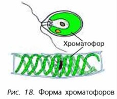 У клеток водорослей есть особенности, свойственные растительной клетке: наличие клеточной стенки, вакуоль с клеточным соком и хлоропласты. У водорослей крупные хлоропласты могут быть различной формы — спиральной, лентовидной, чашевидной и т. д. (рис. 18). Их называют хроматофорами (от греч. хроматос — цвет, краска и форос — несущий). Кроме хлорофилла, у водорослей могут быть и другие пигменты — жёлтые, оранжевые, красные, синие, которые маскируют зелёную окраску и придают водорослям красный, бурый, золотистый цвет. В процессе фотосинтеза водоросли образуют органические вещества. Воду и растворённые в ней питательные вещества водоросли поглощают всей поверхностью тела.